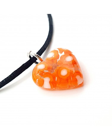 Pendentif en forme de cœur avec des murrines en verre de Murano, des murrines sont incrustées dans le verre. La couleur est orange, la dimension est d'environ 1,5 x 1,5 centimètres, la taille du cordon est de 47 centimètres avec une chainette de 5 centimètres. Ils sont faits à la main par nos artisans italiens. Le coffret est offert.