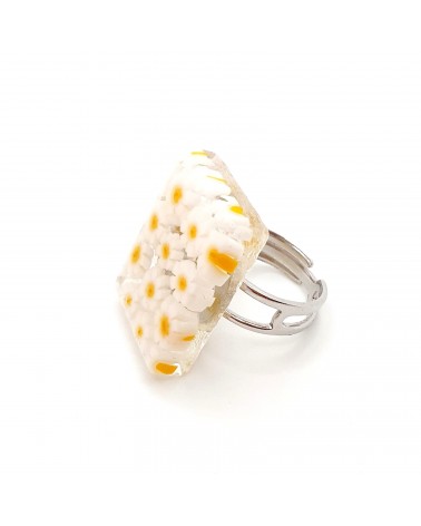 Grande bague rectangle avec murrina incrustée dans le verre de Murano. Le support en acier nickel free est ajustable pour tout les doigts. De couleur blanche et jaune, la dimension du verre et de 2,7x1,8 cm . Toute nos bagues sont faites à la main par nos artisans italiens, elles sont certifiées authentiques.