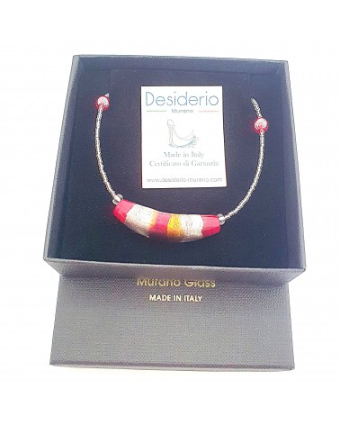 Collier Sasha en verre de Murano, avec une perla-allungata en verre de Murano de couleur rouge et 4 petites perles rouges transparentes. Une feuille d'argent 925 est incrustée dans le verre, la longueur est de 4 centimètres. Tout nos bijoux sont fait à la main par nos créateurs italiens, ils sont certifiées authentiques made in Italy. Le coffret est offert. 100% anti allergique.