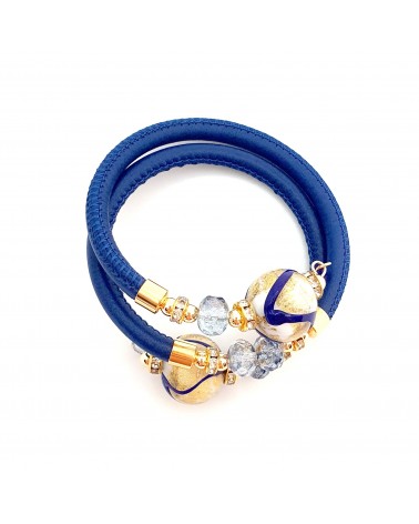 Bracelet Aida double en cuir de Toscane et verre de Murano, métal doré, adaptable à tout les poignets. La Couleur du cuir est bleu et les motifs en verre de Murano sont de nuance bleu, une feuille d'or 24 carat est incrustée dans le verre. Tout nos bijoux sont fait à la main par nos créateurs italiens, ils sont certifiées authentiques made in Italy. Le coffret est offert. 100% anti allergique.